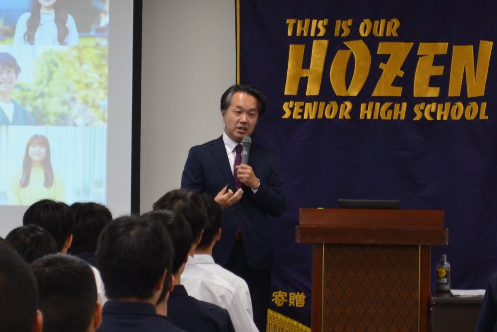 2年文系生徒に対しては拓殖大学の矢部 怜先生に、1年生文系生徒に対しては東京経済大学の阿部 司先生に講演していただきました。