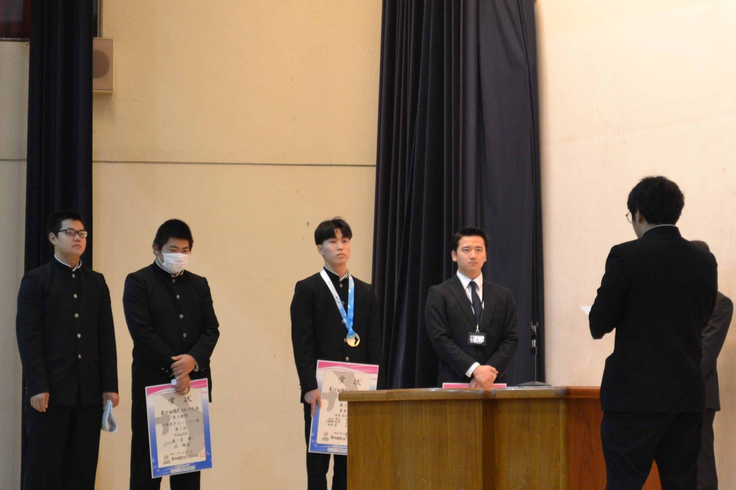 校長講話のあと、陸上競技部・空手道部からの大会結果報告が行われました。