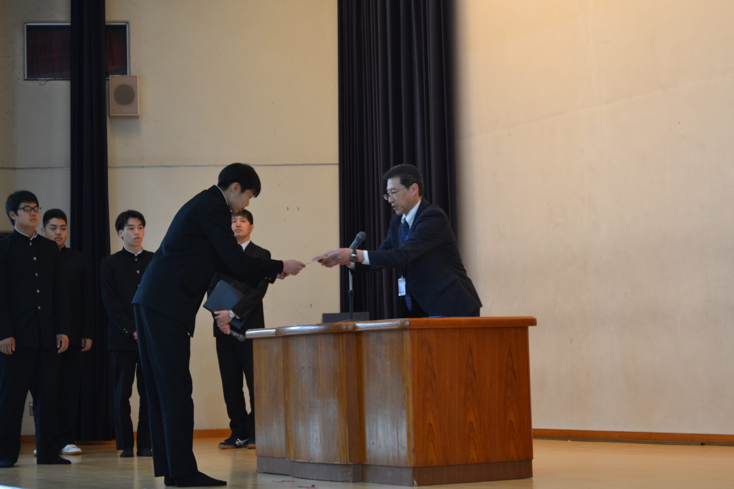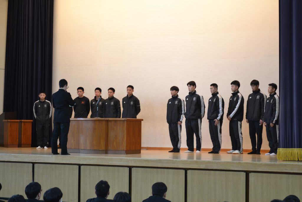 また、春休み中の生活に関する指導講話の後、長野県で行われる全国空手道選抜大会の壮行会が行われました。